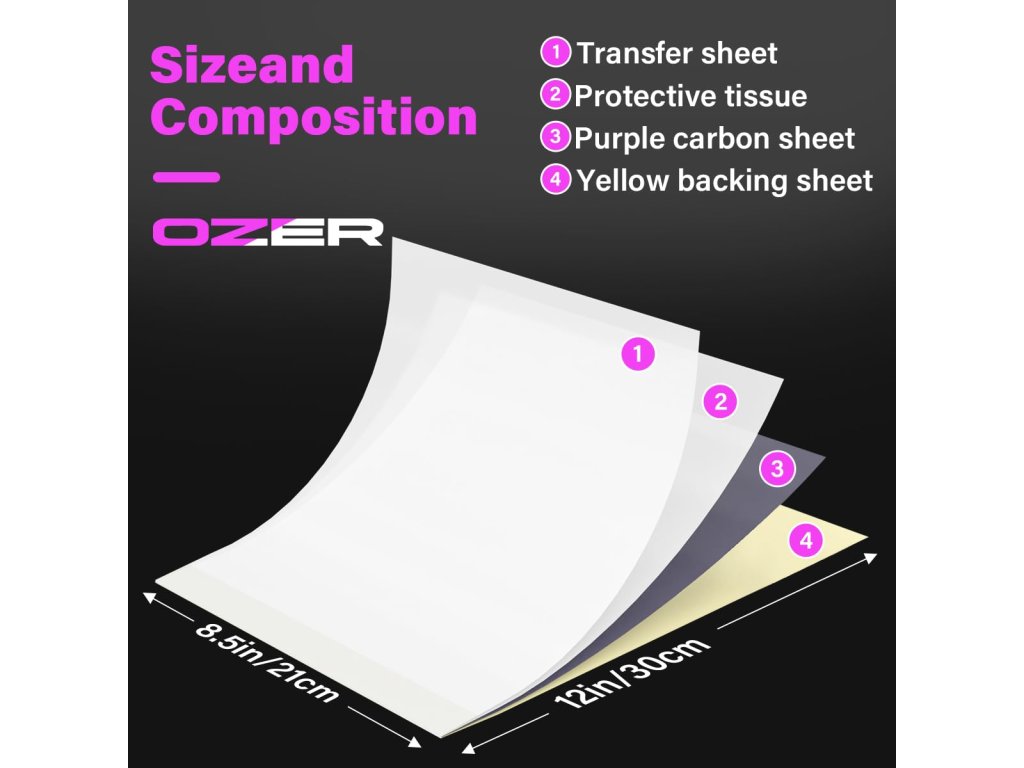 Rozmiar: Papier transferowy 4-warstwowy - Papier do szablonów do tatuażu to 4-warstwowy arkusz zawierający arkusz wzoru, papier ochronny, kalkę i arkusz podkładowy, o wymiarach ok. 8a 2/5 -x 12, 213x305 mm, który można pociąć na mniejsze arkusze, aby uzyskać więcej możliwości.