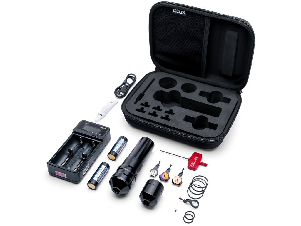 ACUS M2xtd rozszerza serię M2 o akumulator o większej pojemności i korpus o długości 141 mm, co zapewnia lepszą równowagę podczas intensywnej pracy. Oferuje wymienne akumulatory 18650, czas pracy od 9 do 11 godzin, możliwość regulacji skoku igły do 4,5 mm oraz zakres częstotliwości od 36 Hz do 140 Hz (od 3 V do 12 V). Korpus wykonany jest z gładko anodowanego aluminium, w pełni demontowalny bez użycia narzędzi, kompatybilny z uchwytami 33 mm i 40 mm. Tylny wyświetlacz z joystickiem umożliwia zapisanie trzech niestandardowych ustawień, wybór między wyświetlaniem napięcia (V) a częstotliwości (Hz), pomiar czasu pracy, regulację jasności wyświetlacza i automatyczne wyłączanie. Maszyna wyposażona jest w silnik Faulhaber 2214 BXT (bezszczotkowy, wyprodukowany w Niemczech), obsługuje aktualizacje oprogramowania przez USB-C, posiada diodę LED informującą o stanie naładowania oraz zabezpieczenie przed odwrotną polaryzacją, przeciążeniem lub zablokowaniem silnika.