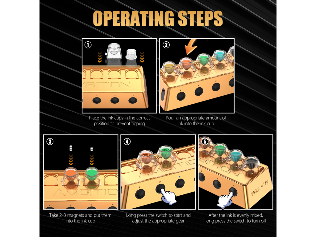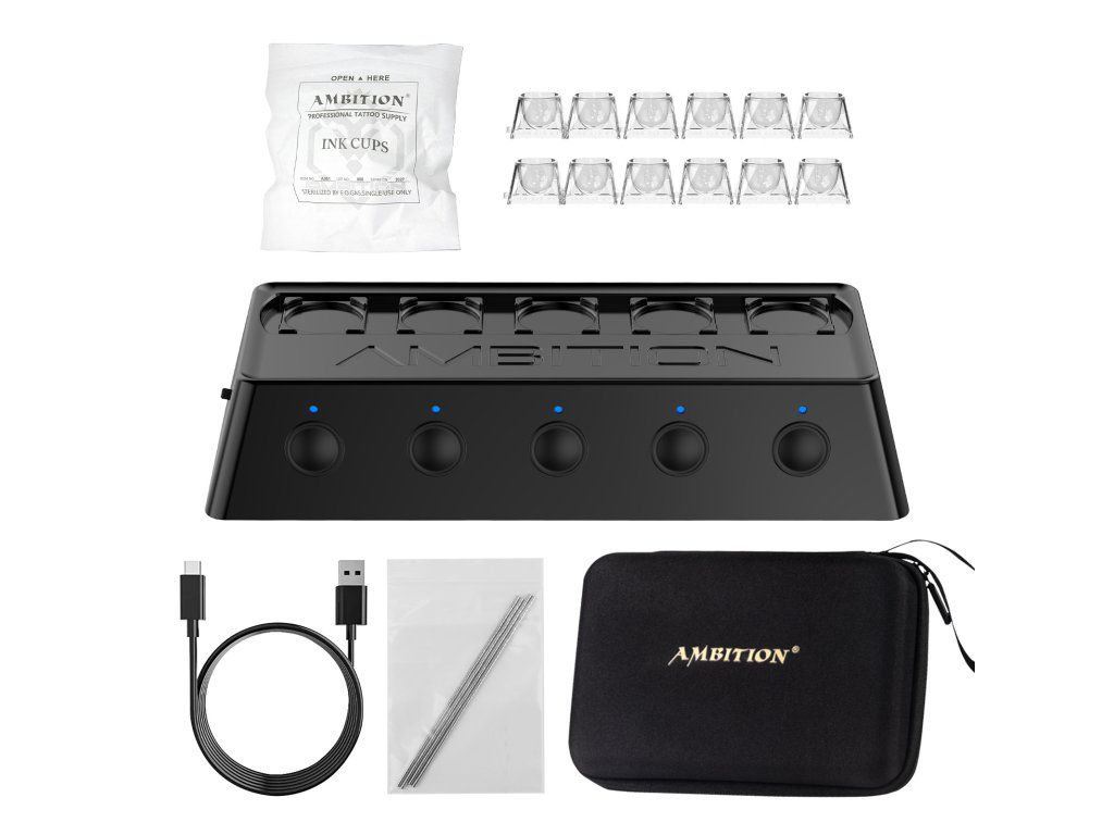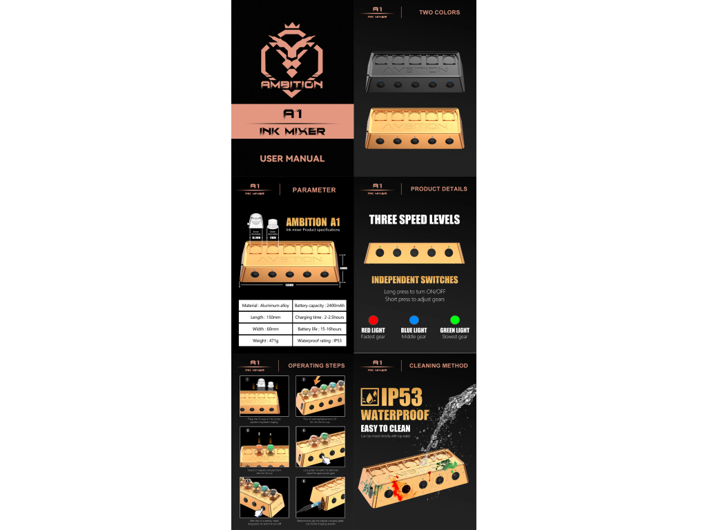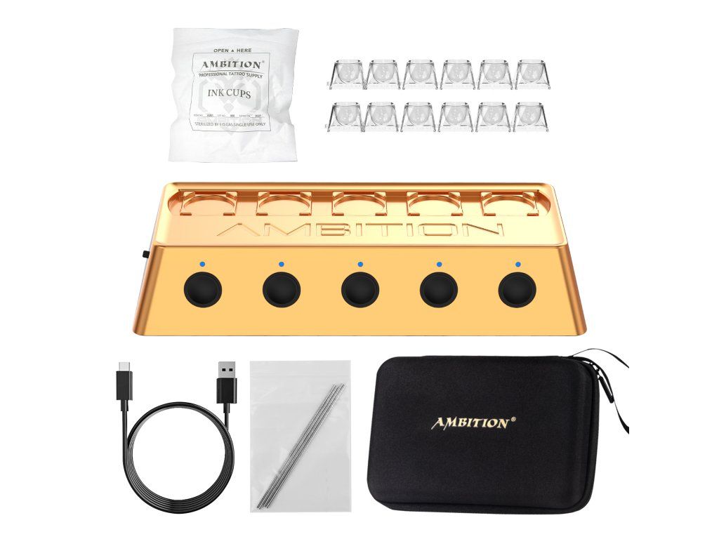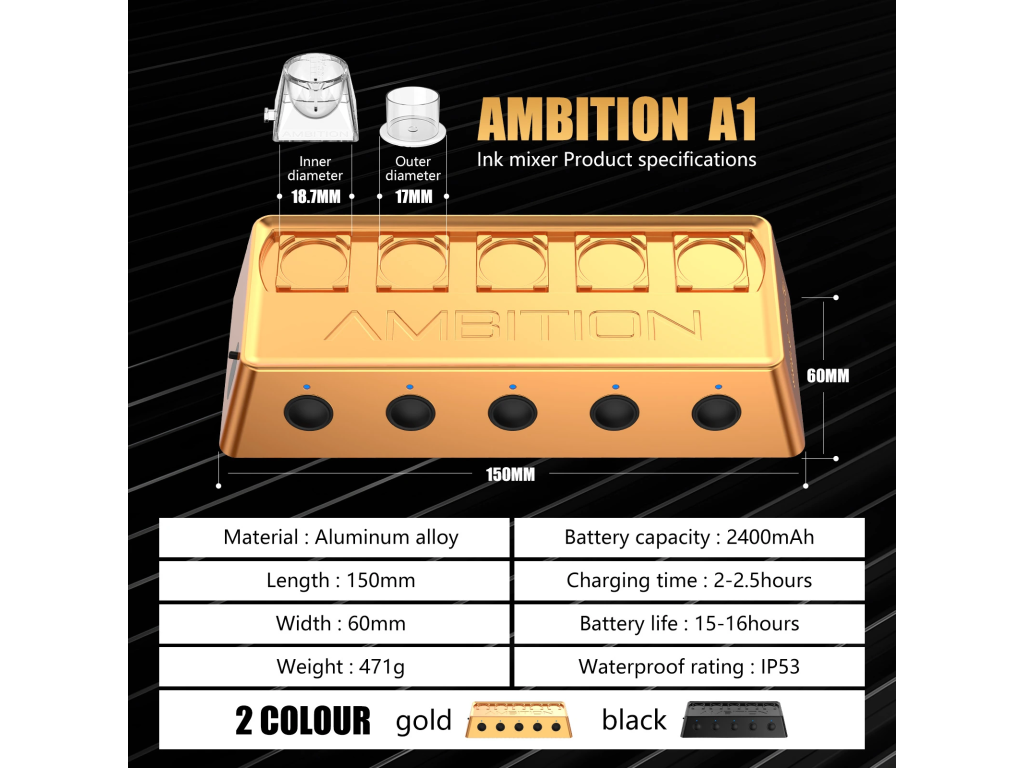 Ambition A1 je kompaktní automatyczny mikser pigmentów dostupný v černé i zlaté variantě. Umożliwia szybkie i równomierne wymieszanie tuszów, pigmentów PMU i innych płynnych mieszanek bez potrzeby ręcznego mieszania.