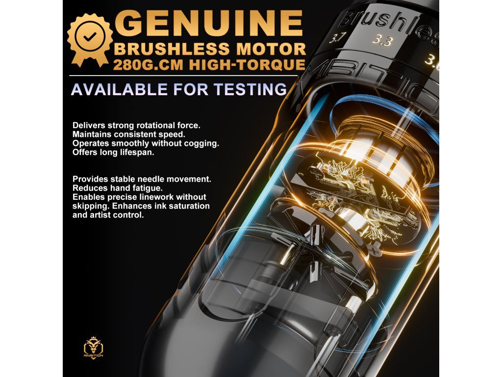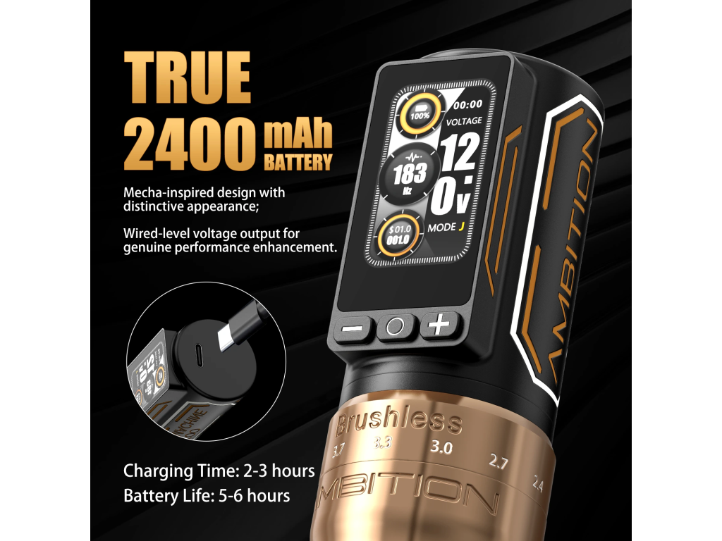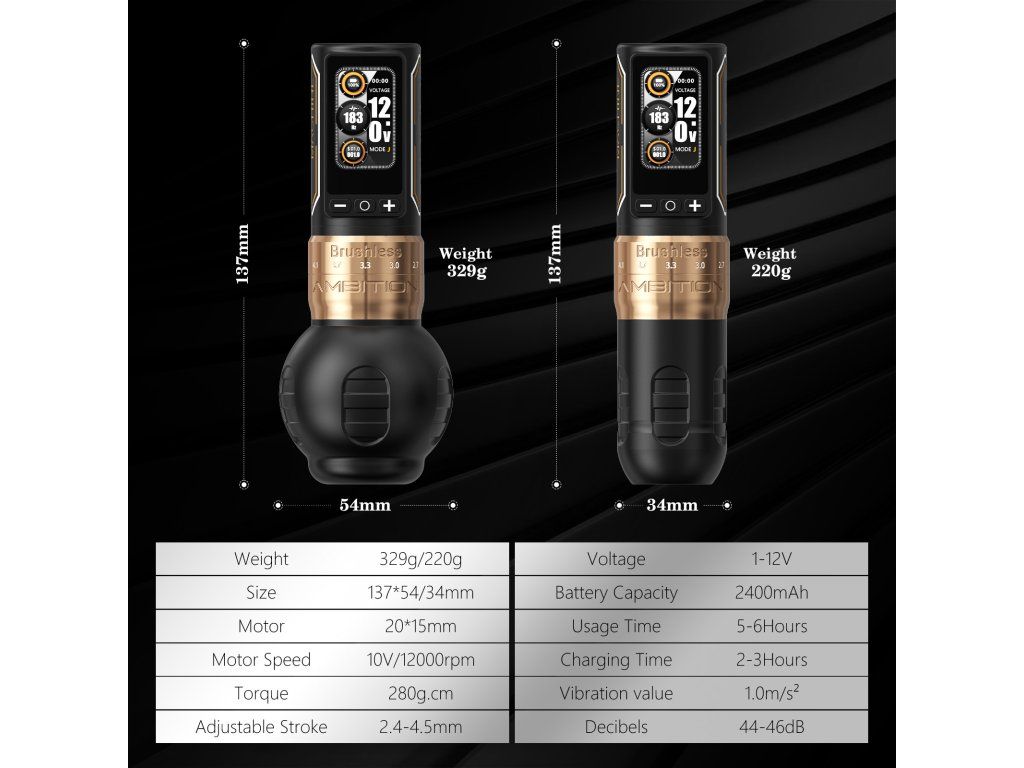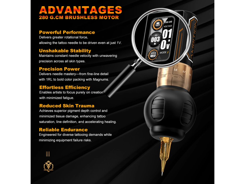 Ambition Ninja Max 280 Dual Battery je bezprzewodowa maszynka do tatuażu s vysokým výkonem, nastavitelným zdvihem 2,4 do 4,5 mm a 2 bateriemi w zestawie. Złota varianta spojuje silný motor, širší rozsah nastavení a výrazné provedení pro každodenní práci ve studiu.