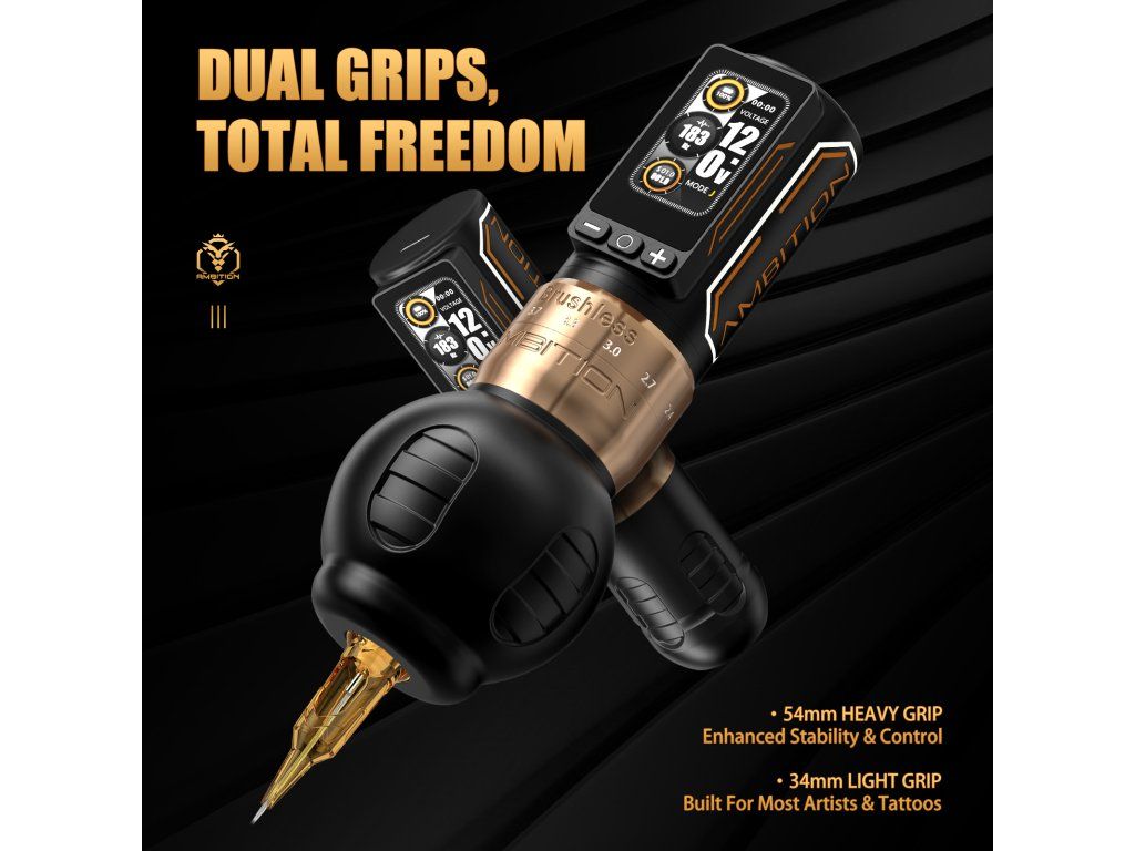 Szerszy grip 54 mm zapewnia większą stabilność i podparcie podczas dłuższych sesji. Węższy grip 34 mm zmniejsza z kolei całkowitą wagę i może lepiej pasować tatuatorom, którzy preferują lżejszy i węższy chwyt.