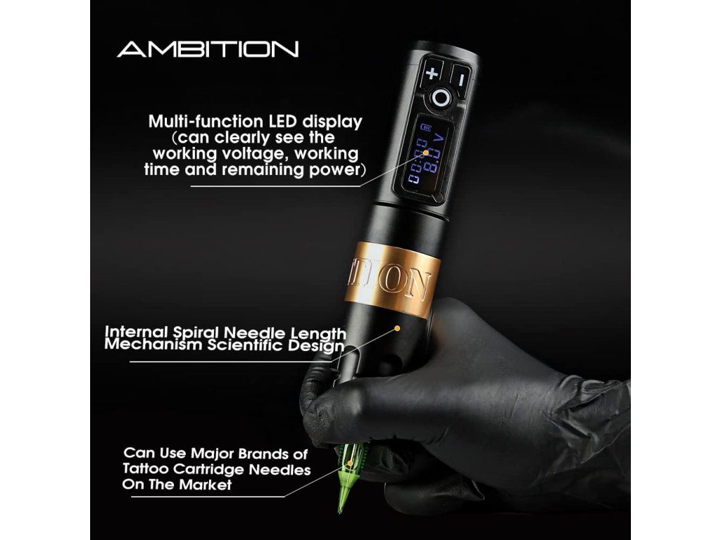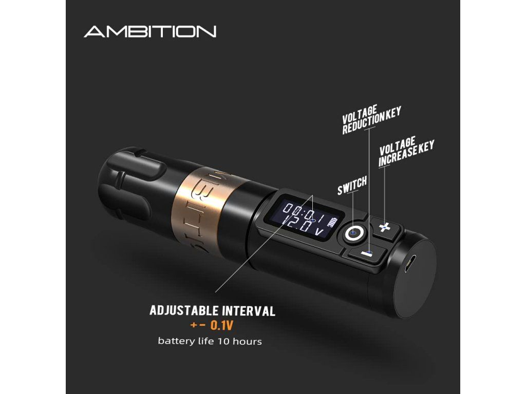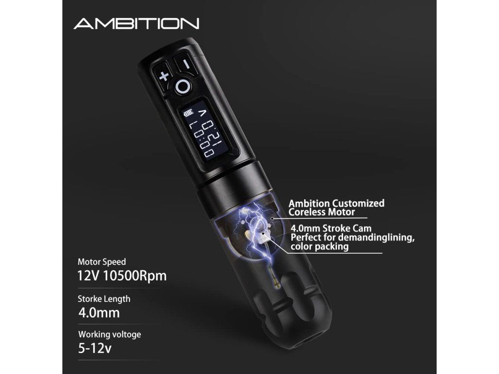 Ambition Soldier Dual Battery to bezprzewodowa maszynka do tatuażu z napędem direct drive, skokiem 4,0 mm i 2 bateriami w zestawie. Czarny wariant jest przeznaczony dla tatuatorów, którzy chcą wyważonego połączenia mocy, czasu pracy i kompaktowego kształtu do codziennej pracy w studiu.