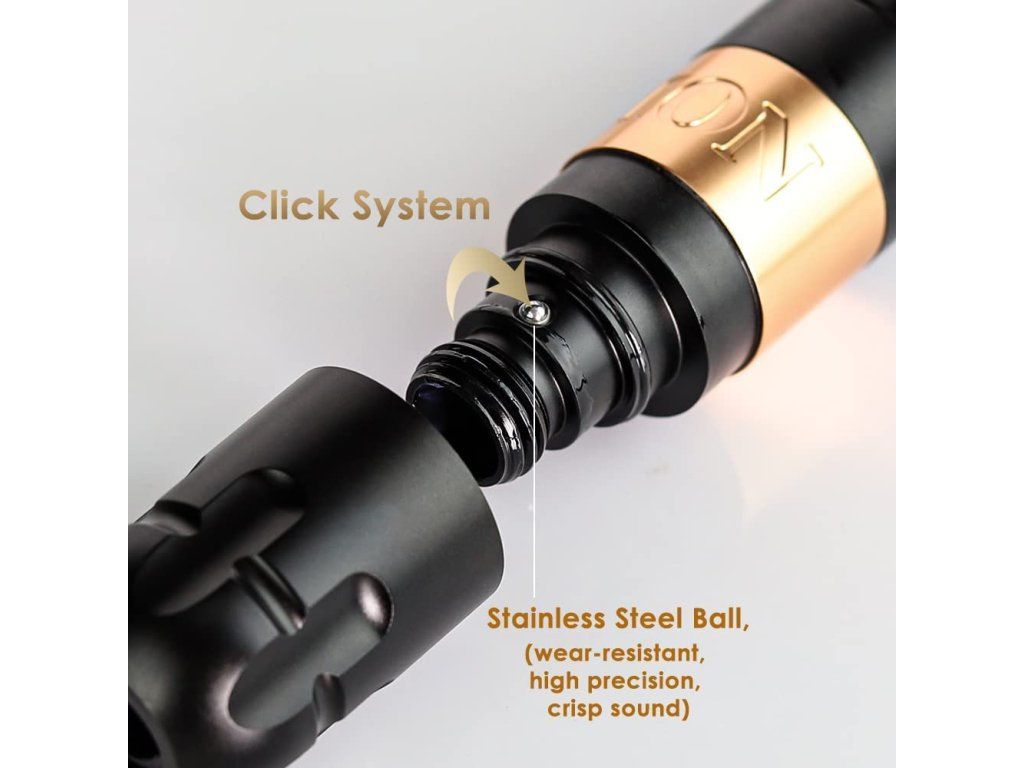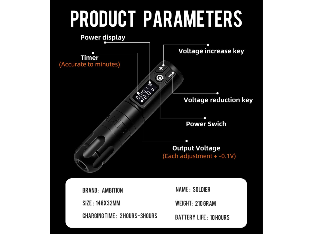 Model Soldier opiera się na silniku coreless, napędzie direct drive i dobrze wyważonej konstrukcji. Skok 4,0 mm wspiera pewniejsze prowadzenie przy liniach i wypełnieniach, a 2 baterie w zestawie poprawiają płynność pracy podczas dłuższych sesji. Dzięki adapterowi RCA maszynkę można używać także w trybie przewodowym.