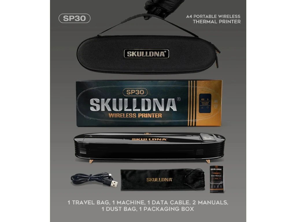 SKULLDNA SP30 to przenośna drukarka termiczna zaprojektowana do wygodnego drukowania stencil bez konieczności stałego połączenia kablowego. Obsługujest połączenie przez Bluetooth i USB, współpracujest z telefonami, tabletami i komputerami oraz jest kompatybilna z systemami Android, Apple, Windows i MacOS. Drukarka wykorzystujest format A4, ma błyszczącą powierzchnię w stylu piano finish i jest uzupełniona kolorowym wyświetlaczem, na którym można śledzić stan pracy urządzenia.