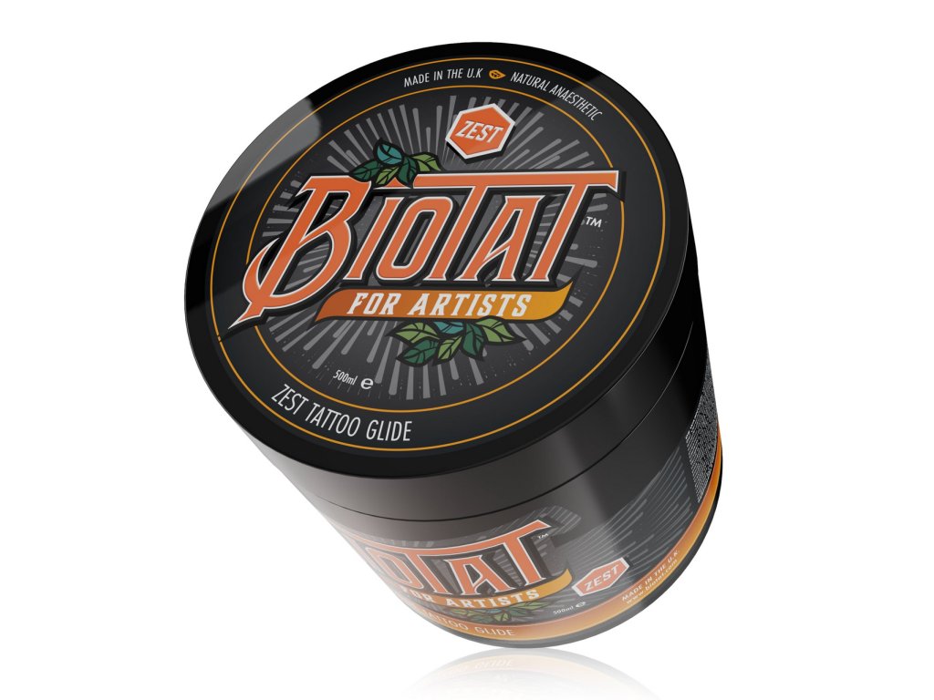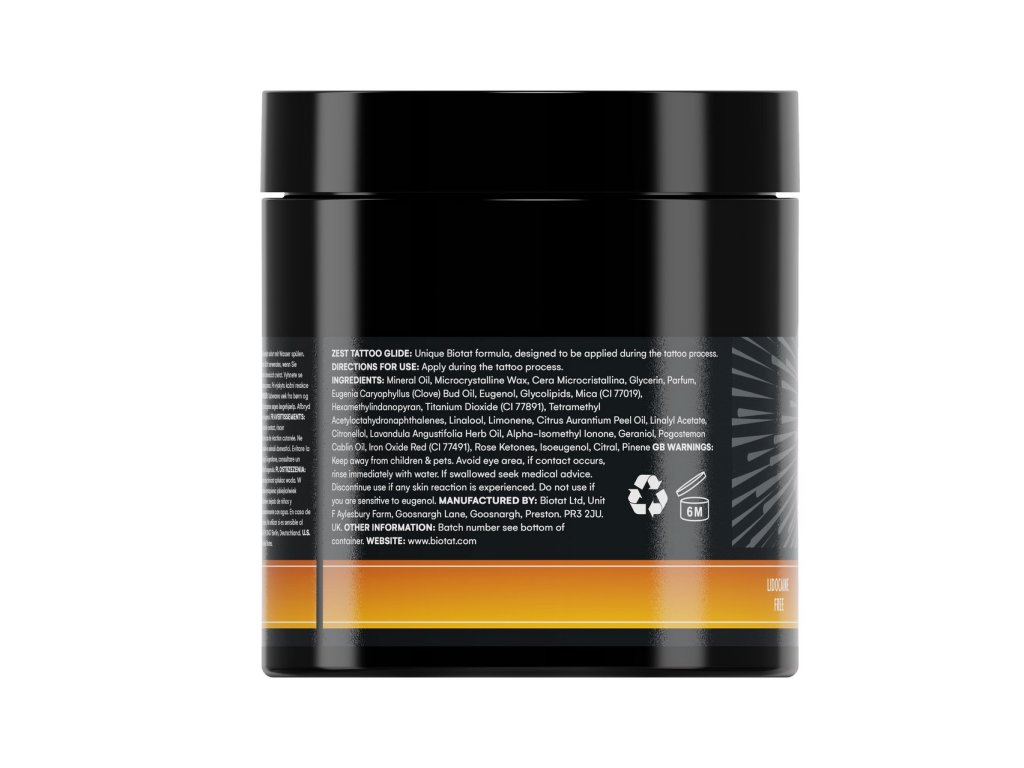 Biotat masło cytrusowe zostało specjalnie opracowane do stosowania podczas tatuowania. Zawiera naturalny olejek goździkowy, który działa jak miejscowe znieczulenie i pomaga złagodzić ból oraz podrażnienia – bez użycia lidokainy. Delikatny cytrusowy zapach dodatkowo zapewnia przyjemny efekt odświeżenia.
