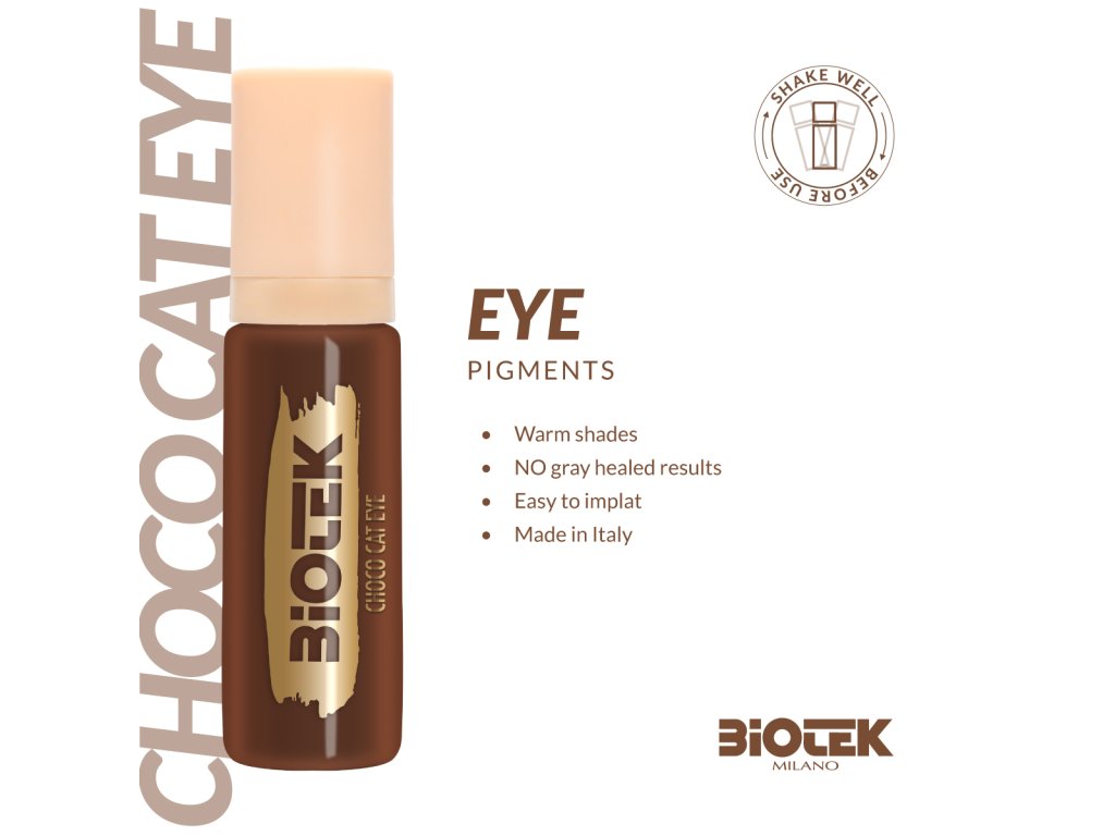 Biotek Choco Cat Eye to profesjonalny pigment do makijażu permanentnego eyelinerem. Odcień to ciepły, ciemnobrązowy kolor, stworzony z myślą o delikatnych, cieniowanych kreskach i naturalnym wyglądzie oka. Ostateczny odcień dopasowuje się do skóry i nie tworzy ostrego, graficznego efektu.