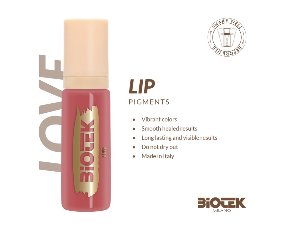 Pigment Biotek Love został opracowany jako uniwersalny średni różowy odcień do PMU ust i microbladingu. Kolor plasuje się dokładnie między różowym a ceglastoczerwonym, co zapewnia, że nie jest ani zbyt intensywny, ani zbyt niewidoczny. Wyprodukowano go we Włoszech z wysokiej jakości surowców, wegańskiej formuły i nie testowano na zwierzętach. Formuła zapewnia pełne krycie, stabilny efekt bez niepożądanych przesunięć koloru po zagojeniu i jest gotowa do natychmiastowego użycia bez konieczności dodawania modyfikatorów.