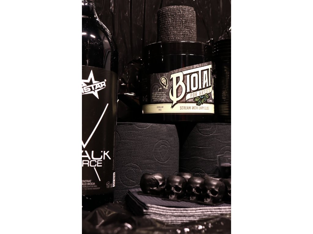 Black Widow Pack jest przeznaczony dla studiów, które preferują elegancki, spójny wygląd wyposażenia. Zawiera czarne rękawiczki Uniprotect, czarne podkładki i taśmę ochronną na grip. Tematyczny charakter podkreślają kubeczki Saferly w kształcie 3D czaszki oraz czarne mydło do tatuażu Unistar. Klimat dopełnia świeca Yankee Candle Black Coconut oraz halloweenowe słodycze Trolli. Każdy szczegół zestawu – czarny jak noc.