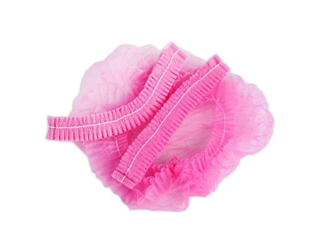 Różowa czepek ochronny do zakrywania włosów podczas pracy.