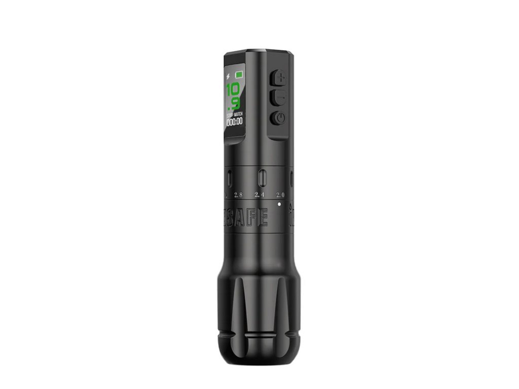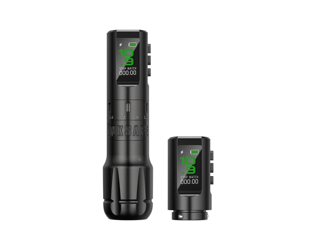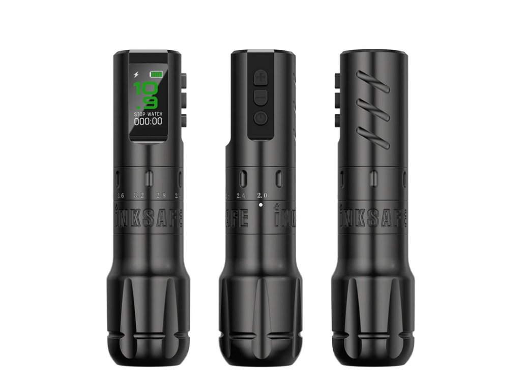 Bezprzewodowa golarka do tatuażu Inksafe Flexo zapewnia maksymalną swobodę ruchów i precyzję dzięki skokowi 4,0 mm. Oferuje 6 regulowanych skoków: 2,0 - 2,4 - 2,8 - 3,3 - 3,8 - 4,2 mm. Ta ergonomicznie zaprojektowana maszyna jest wyposażona w dwa wydajne akumulatory PowerBolt zapewniające długą żywotność i łatwą wymianę podczas pracy. Bezkartuszowy silnik na ekranie - wygodny, zapewniający stabilność i żywotność.
