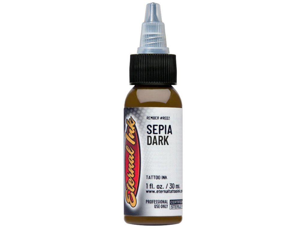 ETERNAL INK Sepia Medium do pigmentu w kolorze sepii, opracovany jako czela autorskiej palety tatuaży Rembera Orellana we szołobroj z marką Eternal Ink. Odcień ten zostrowzony do pracy z ciepłymi tonami, miękkimi przejściami i budowaniem głębi w realistycznych, ilustracyjnych i surrealistycznych motywach. Nadaje się do płynnych przejść między jaśniejszymi i ciemniejszymi odcieniami, modelowania objętości i pracy z ciepłą tonacją bez nadmiernego kontrastu. Pigment można stosować samodzielnie lub w połączeniu z innymi odcieniami z palety Rember w celu uzyskania spójnej struktury kolorystycznej.