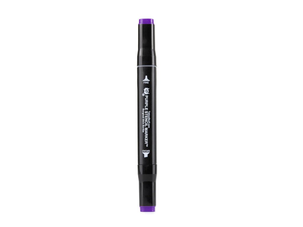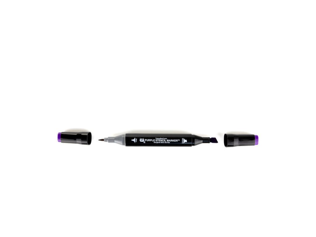 Nowy i ulepszony fioletowy marker Stencil Stuff powraca! Zgodnie z mottem "dwa jest lepsze niż jeden", ten marker ma dwie końcówki, które mogą być używane do drobnych szczegółów lub wypełniania większych obszarów skóry. Pędzelkowa końcówka Purple Stencil Marker jest idealna do drobnych detali i szkicowania na skórze. Szeroka końcówka markera może być używana do wypełniania większych obszarów. Jest idealny do zgrubnego szkicowania i odręcznego rysowania geometrycznych kształtów lub wzorów, a także grubych linii. przeznaczony do stosowania na skórze.