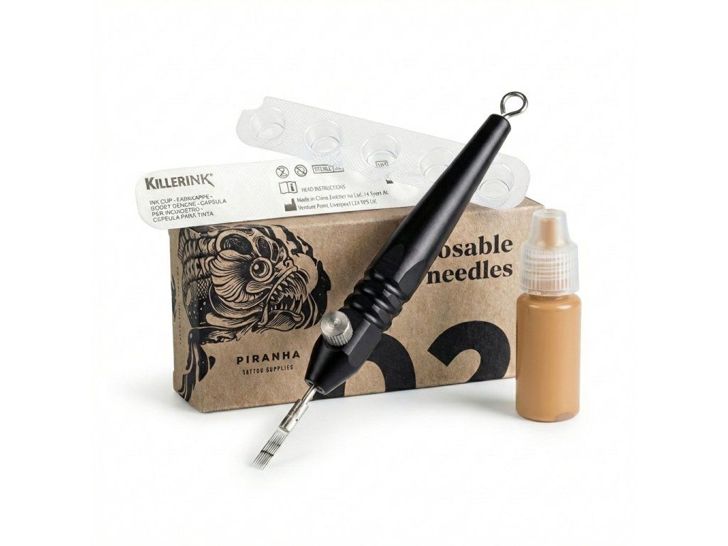 Zestaw łączy narzędzie, igły, kubeczki i tusz, dzięki czemu ułatwia przygotowanie do pracy i pomaga utrzymać porządek na stanowisku. Sprawdza się tam, gdzie liczy się prostota, szybka orientacja w akcesoriach i precyzyjne dozowanie tuszu.