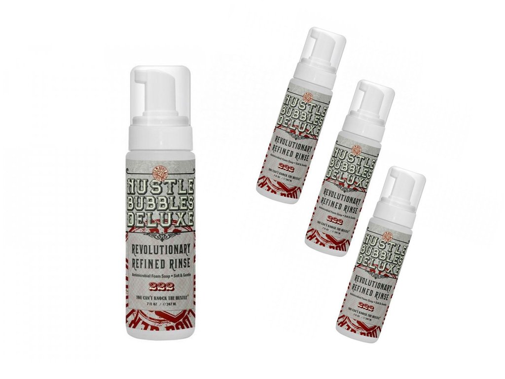 Hustle Bubbles to antybakteryjne mydło do czyszczenia skóry tatuażu w gęstej pianie. Hustle Bubbles Deluxe możesz stosować jako zamiennik zielonego mydła ze względu na jego właściwości antybakteryjne. Hustle Bubbles Deluxe zmniejsza ilość bakterii na skórze, jednocześnie ją zmiękczając, oczyszczając i nawilżając. Nie musisz już nic mieszać – produkt jest już wymieszany, w sprayu z pompką, więc nie trzeba mieszać, wystarczy wycisnąć i użyć.... Hustle Bubbles Deluxe to produkt naturalny, przyjazny weganom i po prostu wspaniale pachnie podobnie jak Hustle Butter Hustle Bubbles Deluxe zamknięty jest w butelce o pojemności 207ml z pompką.