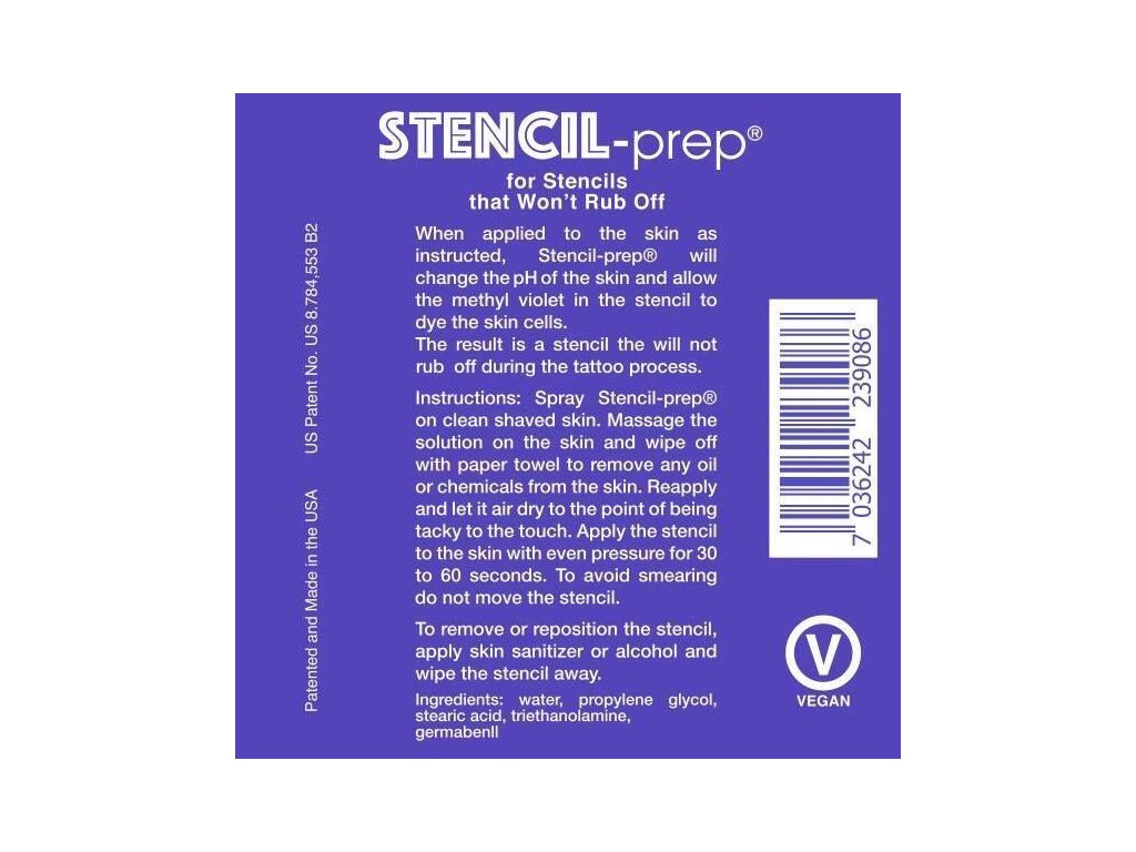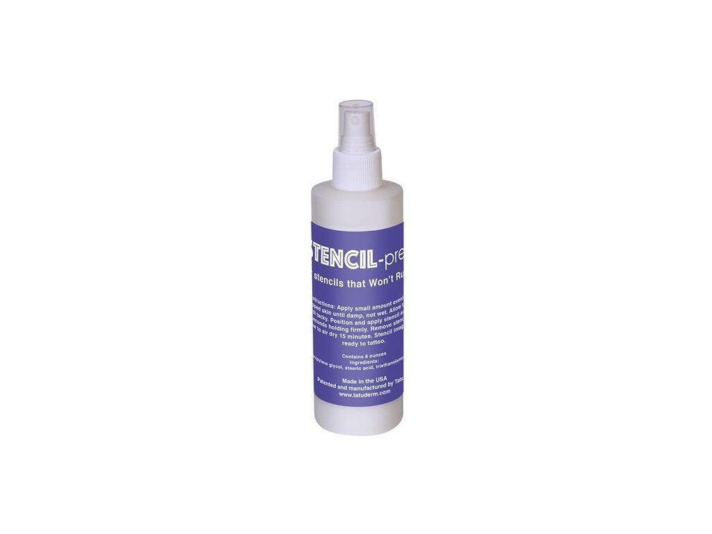 Prep Spray od InkJet Stencils działa jak marker do tatuażu do naklejek na skórze, zarówno z drukarki lub kopiarki, jak i przez tradycyjny papier do kopiowania. Instrukcje: Rozpylić Stencil Prep Spray na czystą, ogoloną skórę. Wmasuj w skórę i wytrzyj do czysta za pomocą ValaClean lub serwetki, aby usunąć pozostałości olejów i chemikaliów. Nałożyć ponownie i pozostawić do wyschnięcia, aż skóra stanie się lepka w dotyku. Następnie dociskaj naklejkę przez 30-60 sekund. Zalecamy użycie płynu InkJet Stencils do drukarek Epson EcoTank i papieru InkJet Stencil Tracing Paper. Alternatywnie można użyć konwencjonalnego papieru do kopiowania ReproFX. Opakowanie zawiera 240 ml w butelce z rozpylaczem. Oczywiście jest trwały i odporny na ścieranie podczas pracy.
