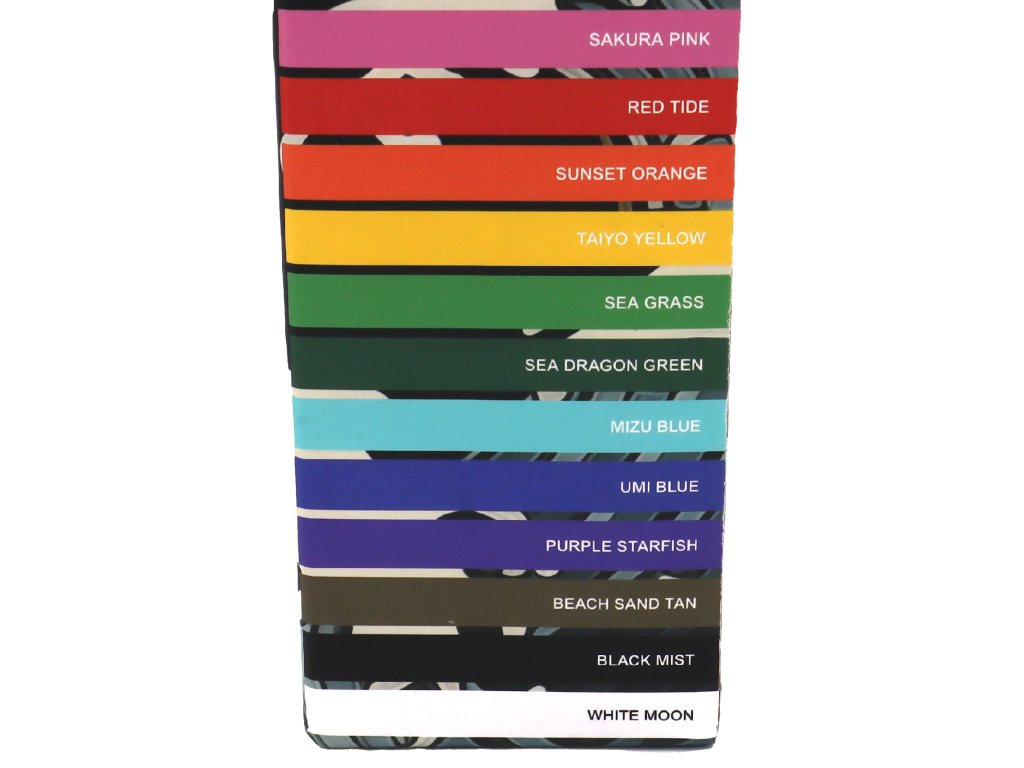 Black Mist, White Moon, Red Tide, Sakura Pink, Sunset Orange, Taiyo Yellow, Beach Sand Tan, Sea Dragon Green, Sea Grass, Mizu Blue, Umi Blue, and Purple Starfish