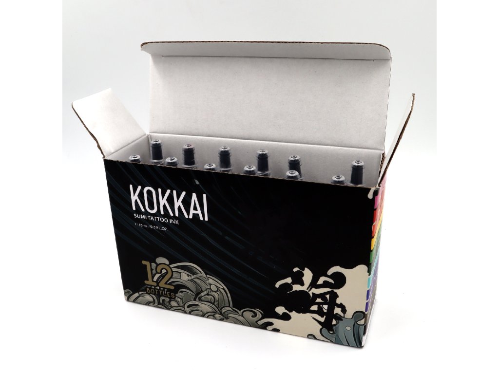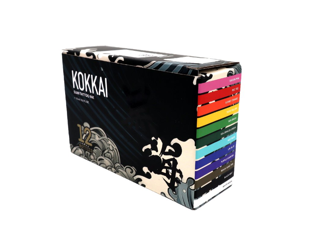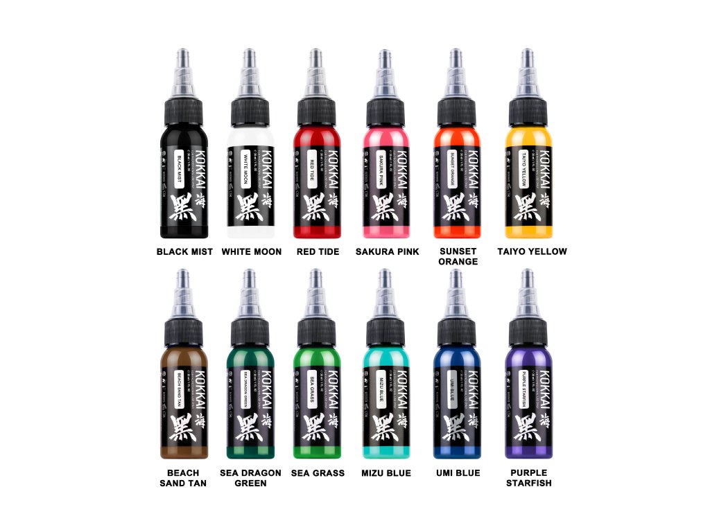 Zestaw 12 kolorów od Kokkai Sumi Inks łączy dwanaście żywych, profesjonalnych pigmentów opracowanych w skrupulatnym procesie, który łączy wiekowe japońskie techniki produkcji tuszu sumi z nowoczesną produkcją tuszu do tatuażu.