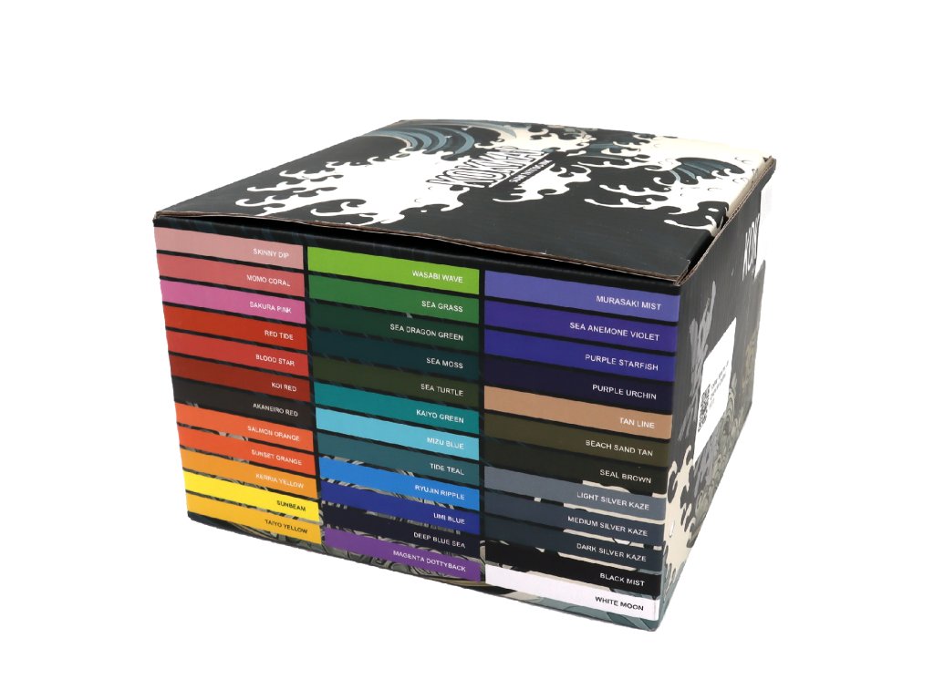 Akaneiro Red, Black Mist, Blood Star, Beach Sand Tan, Deep Blue Sea, Dark Silver Kaze, Kaiyo Green, Koi Red, Kerria Yellow, Light Silver Kaze, Mizu Blue, Momo Coral, Magenta Dottyback, Murasaki Mist, Medium Silver Kaze, Purple Starfish, Purple Urchin, Ryujin Ripple, Red Tide, Sunbeam, Sea Anemone Violet, Seal Brown, Skinny Dip, Sea Dragon Green, Sea Grass, Sea Moss, Salmon Orange, Sakura Pink, Sea Turtle, Sunset Orange, Tan Line, Tide Teal, Taiyo Yellow, Umi Blue, Wasabi Wave, White Moon