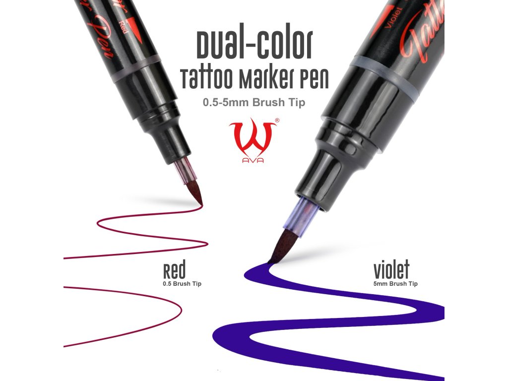 Marker SKULLDNA z podwójną końcówką został zaprojektowany jako funkcjonalne narzędzie pracy dla profesjonalnych studiów tatuażu. Łączy dwa kolory i dwie różne szerokości końcówek w jednym markerze, eliminując potrzebę ciągłej wymiany markerów. Czerwona końcówka jest zoptymalizowana pod kątem precyzyjnych linii, zaznaczania konturów i drobnych korekt. Fioletowa końcówka służy do bardziej wyrazistych pociągnięć, zaznaczania orientacji i szybkiego wypełniania obszarów.