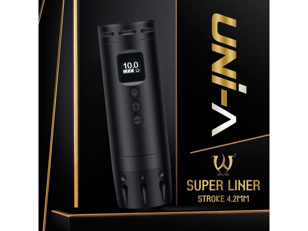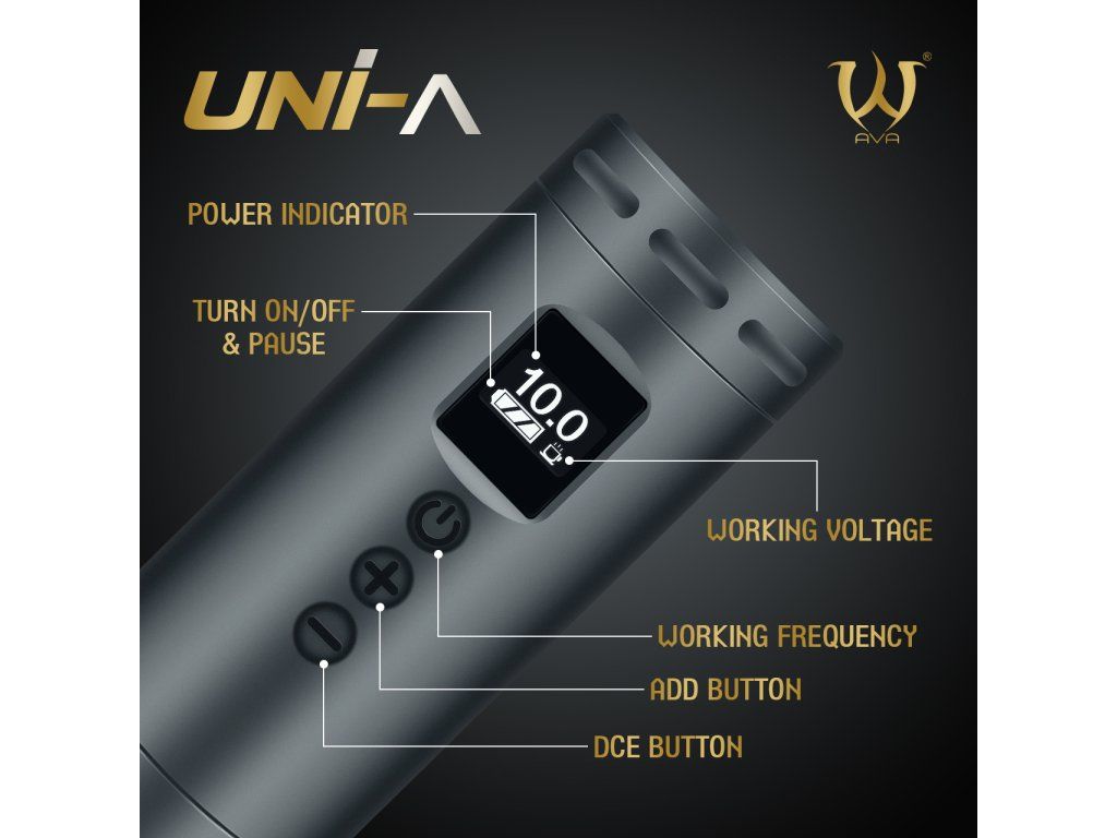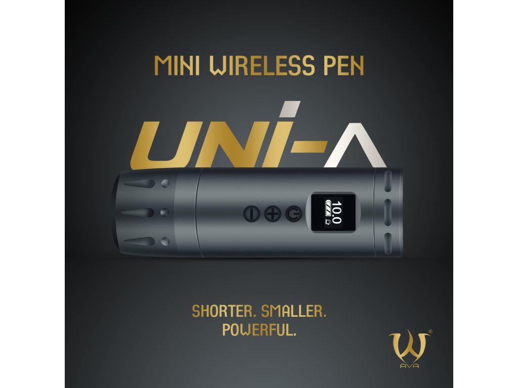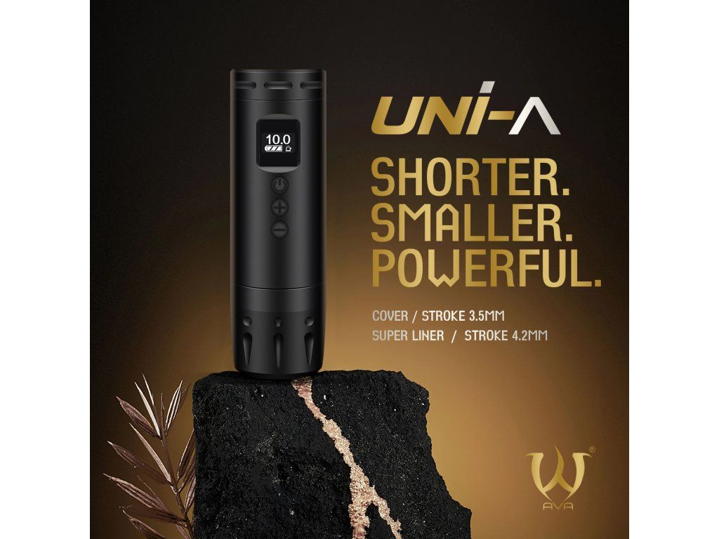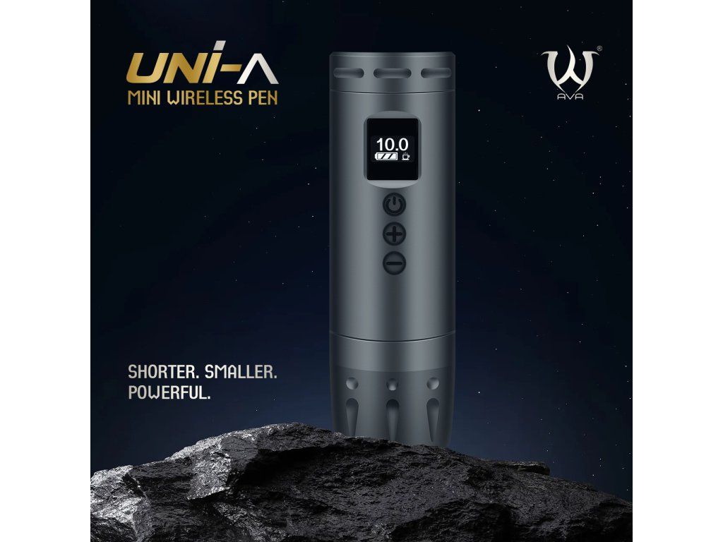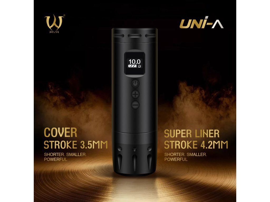 AVA UNI A w kolorze szarym z skokiem 3,5 mm to lekka bezprzewodowa maszynka do tatuażu z krótką obudową i czytelnymi elementami sterującymi. Idealna dla tatuatorów, którzy szukają mobilnego rozwiązania bez zbędnie solidnej konstrukcji.