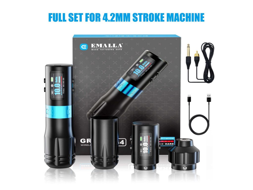EMALLA Grand G4 to bezprzewodowa maszynka w stylu pena, przeznaczona do profesjonalnego tatuowania. Jest to czwarta generacja serii Grand, która oferuje ulepszony silnik bezszczotkowy, nowoczesny wyświetlacz LED i wygodne uchwyty w dwóch rozmiarach.