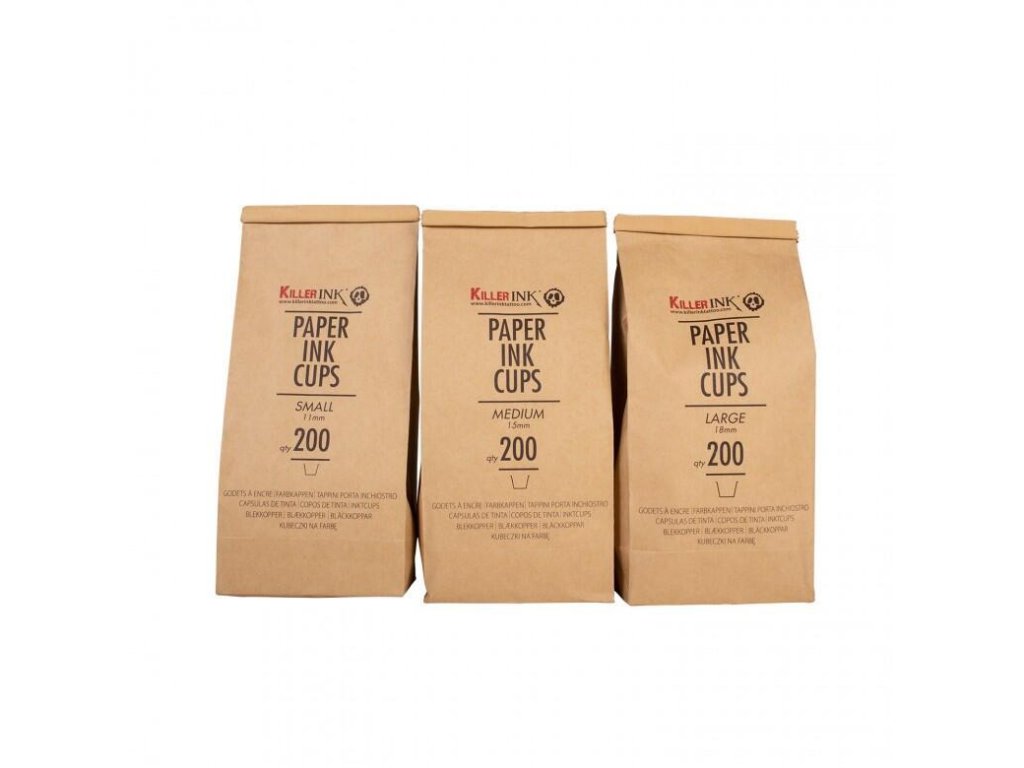 Kubki papierowe do użytku w tatuażu. Wykonane z masy papierowej, wodoodporne i przyjazne dla środowiska. Dostępne w 3 rozmiarach, w opakowaniach po 200 sztuk.Parametry dodatkowe