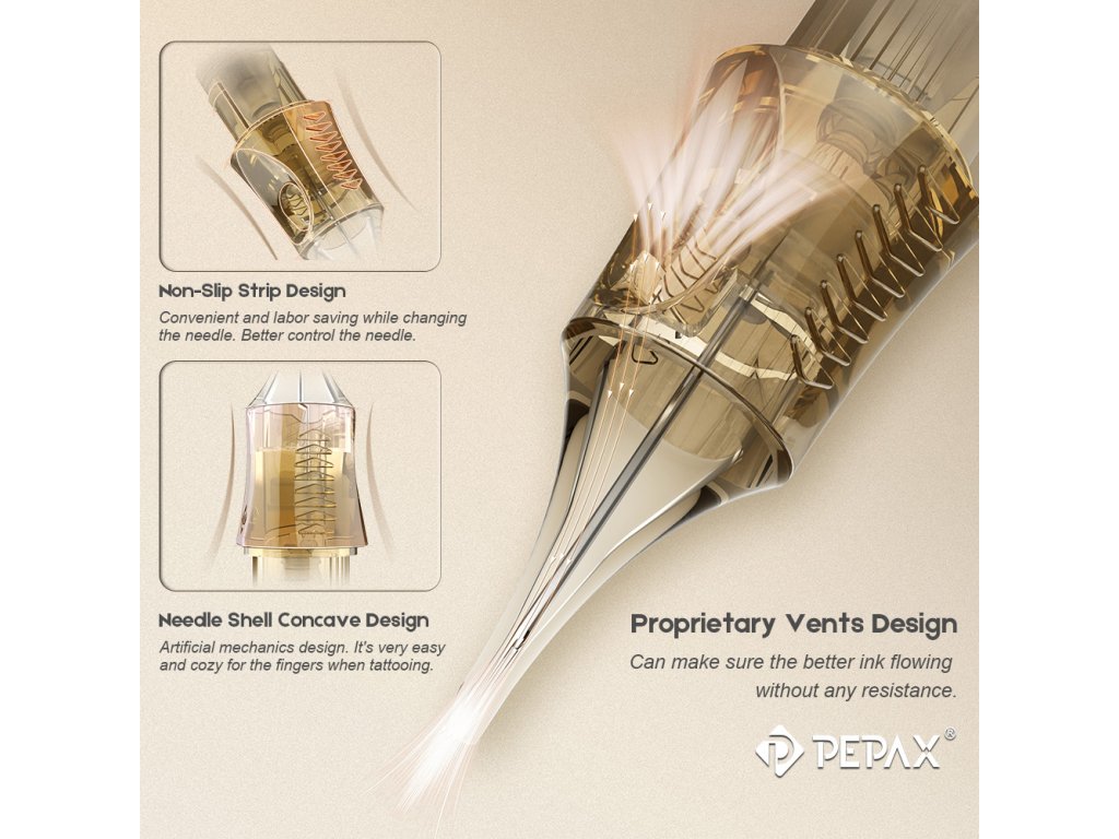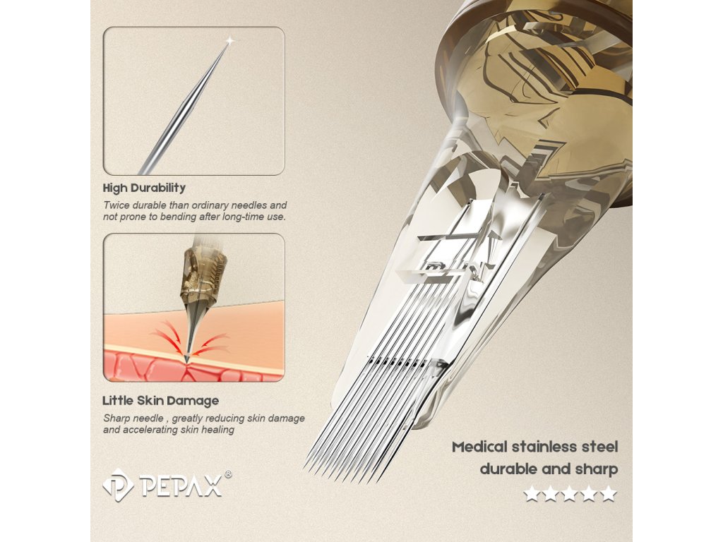 Nowe igły w kartuszach z membraną zabezpieczającą firmy PEPAX zapewniają wyższy poziom bezpieczeństwa i wydajności. Plastikowe opakowanie wykonane jest z materiału PC klasy medycznej, który zapewnia większe bezpieczeństwo niż powszechnie stosowany PVC. Igły wykonane są z japońskiej stali nierdzewnej, z ręcznym ostrzeniem i precyzyjnym pozycjonowaniem dla optymalnej jakości i wydajności.