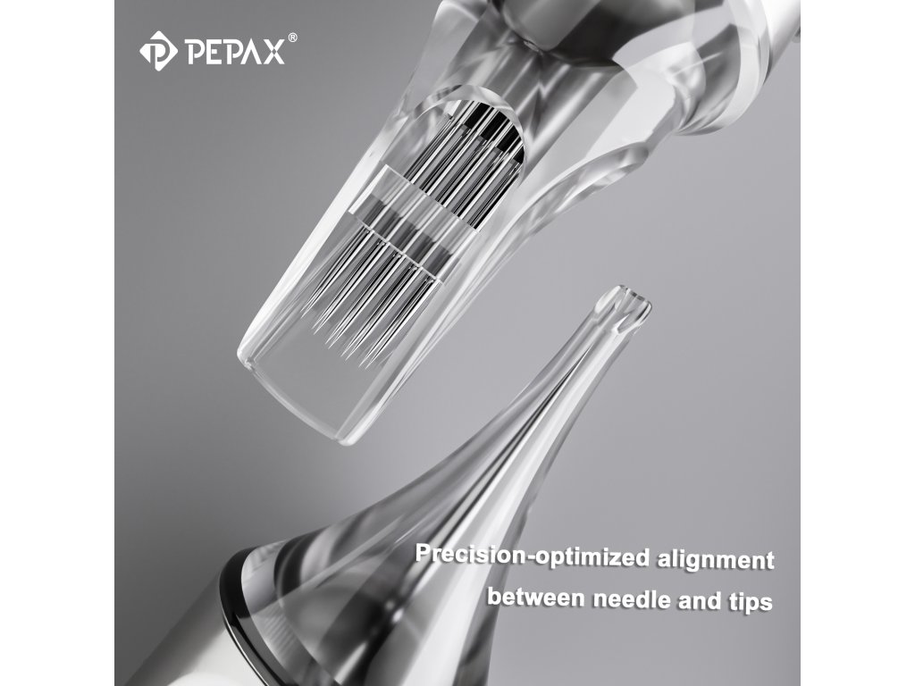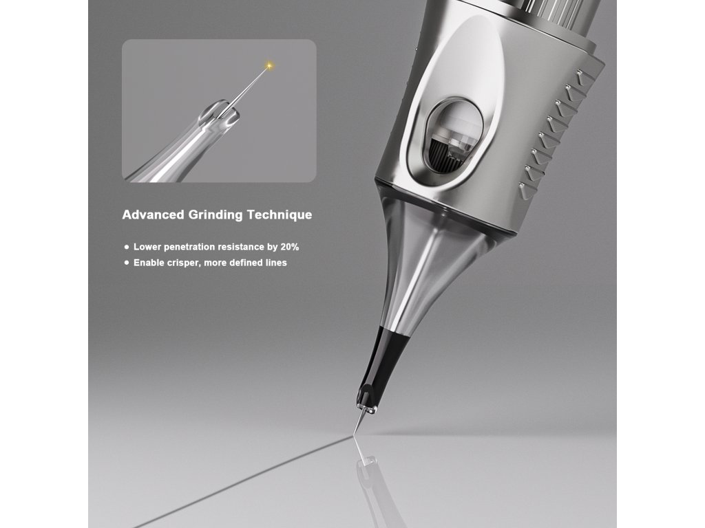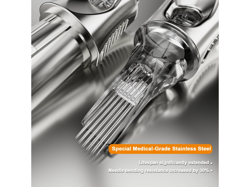 W kartridżach zastosowano zaawansowaną technologię szlifowania, która zmniejsza opór podczas penetracji skóry i umożliwia płynniejszy i bardziej kontrolowany ruch igły. Igły wykonane są ze specjalnej stali nierdzewnej o jakości medycznej, która zwiększa odporność na zginanie i pomaga zachować stabilny kształt nawet podczas długotrwałej pracy.