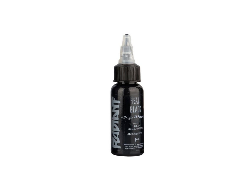 Radiant Ink Real Black to czarny tusz do tatuażu z gamy kolorów marki Radiant Ink. Produkt przeznaczony jest do stosowania podczas tatuowania maszynką do tatuażu. Konsystencja koloru odpowiada powszechnemu standardowi płynnych pigmentów do tatuażu stosowanych w profesjonalnych studiach.
