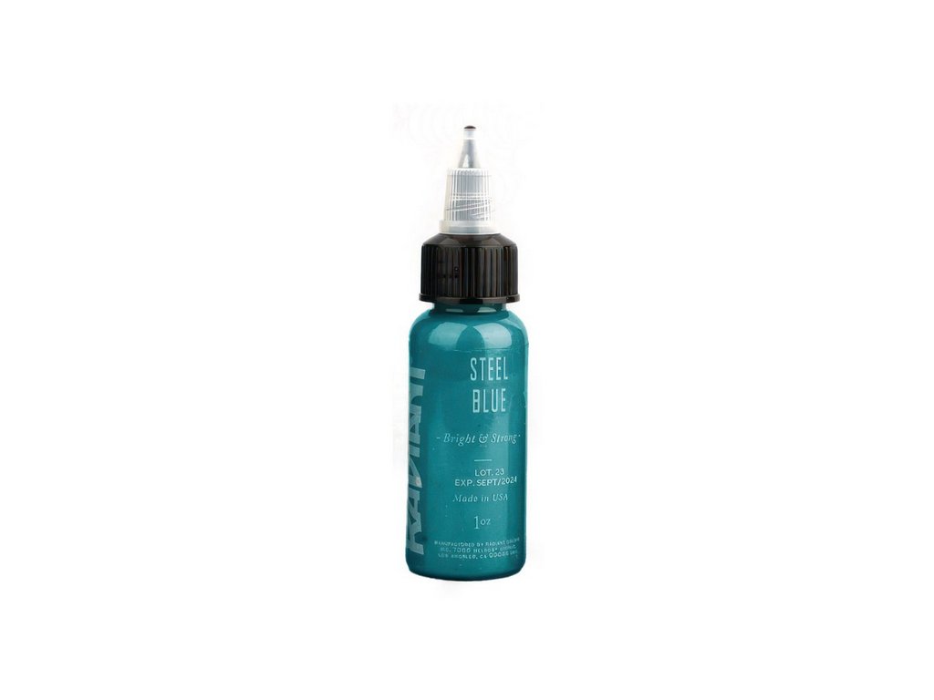 Radiant Ink Steel Blue to niebieski tusz do tatuażu z gamy kolorów marki Radiant Ink. Produkt przeznaczony jest do stosowania podczas tatuowania maszynką do tatuażu. Konsystencja tuszu odpowiada standardowi płynnych pigmentów do tatuażu stosowanych w profesjonalnych studiach.
