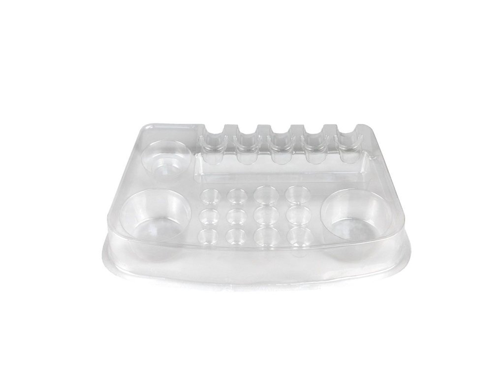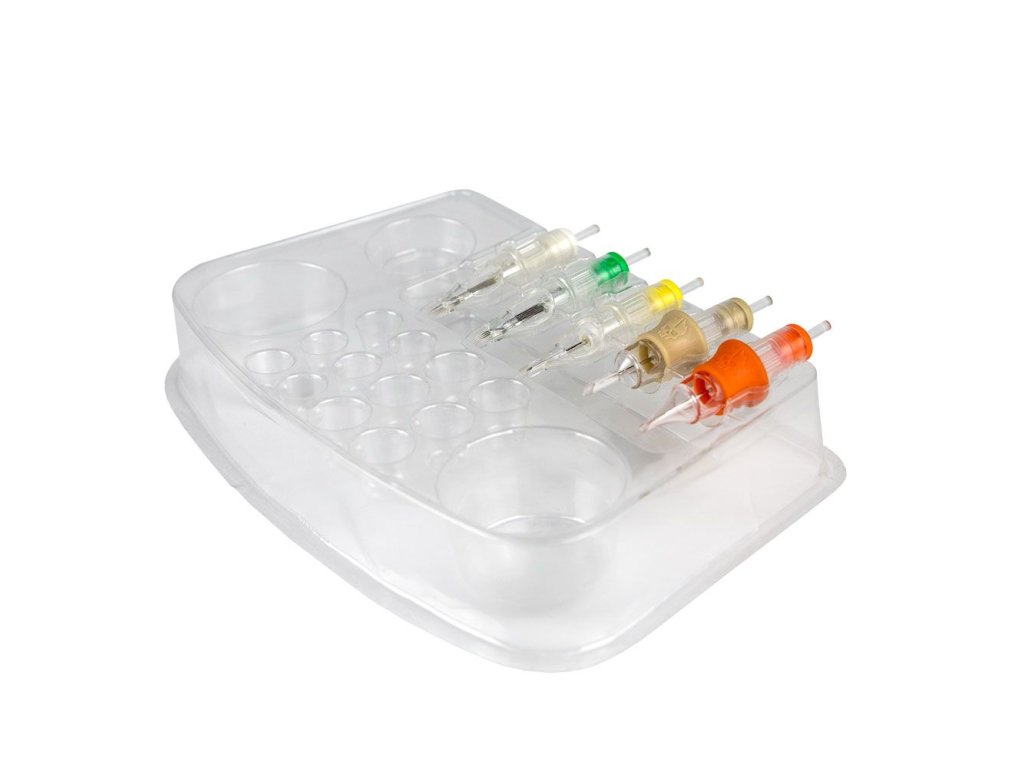 Każdy stojak zawiera 16 zintegrowanych kubeczków na farbę (układ 4×4) w czterech rozmiarach, dwa wgłębienia na wodę i jedno na krem. W stojaku można umieścić do 5 cartridge wszystkich popularnych marek. Praktyczny przedni rowek zapobiega wysychaniu cartridge.