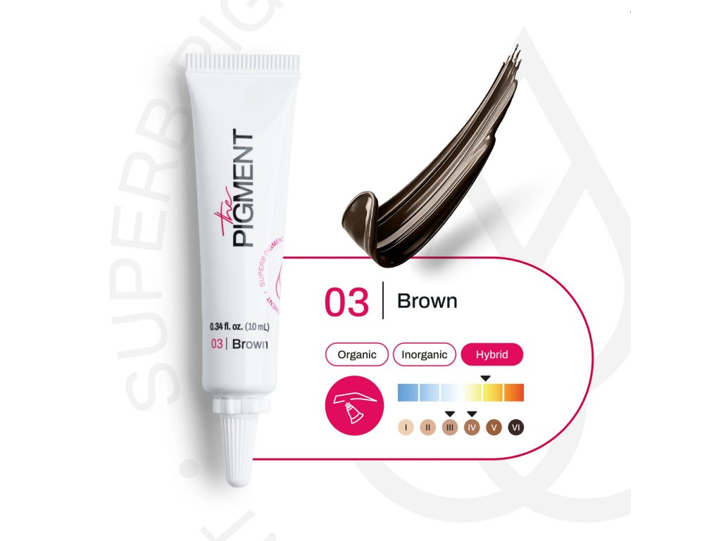 Konsystencja pigmentu ułatwia aplikację, zapewniając precyzyjne rozmieszczenie pigmentu i równomierne gojenie. Brąz 3 można stosować samodzielnie lub mieszać z innymi brązowymi pigmentami, aby uzyskać odcienie przejściowe i indywidualne. Idealny dla klientek o typie cery Fitzpatrick 3-4, które poszukują ciepłego, naturalnego odcienia brwi o bardziej wyrazistym efekcie.