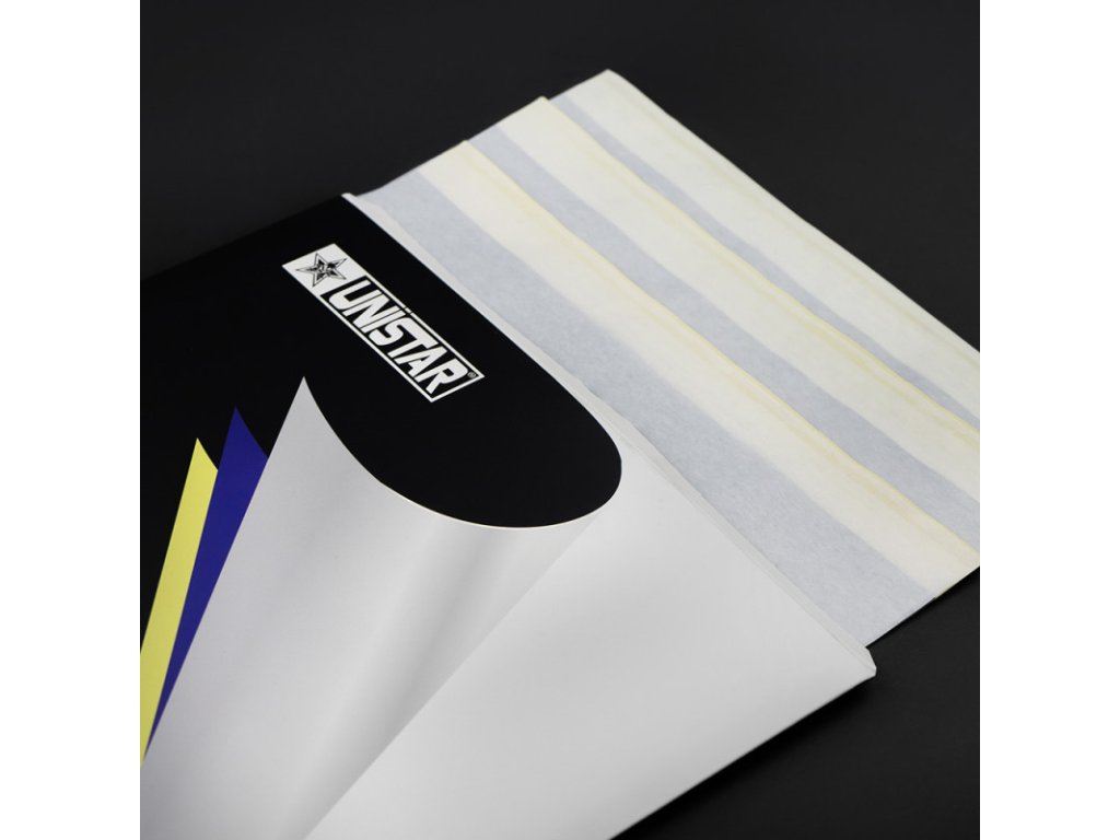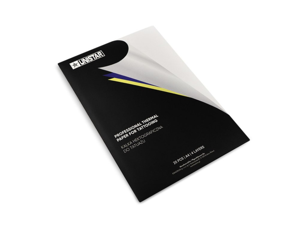 Unistar Hectograph Paper Purple to wysokiej jakości papier do kalki przeznaczony do precyzyjnego przenoszenia Twojego projektu na skórę. Jest kompatybilny z większością drukarek termicznych dostępnych na rynku i pozwala na tworzenie czystych, ostrych i szczegółowych konturów, które doceni każdy profesjonalny tatuażysta.