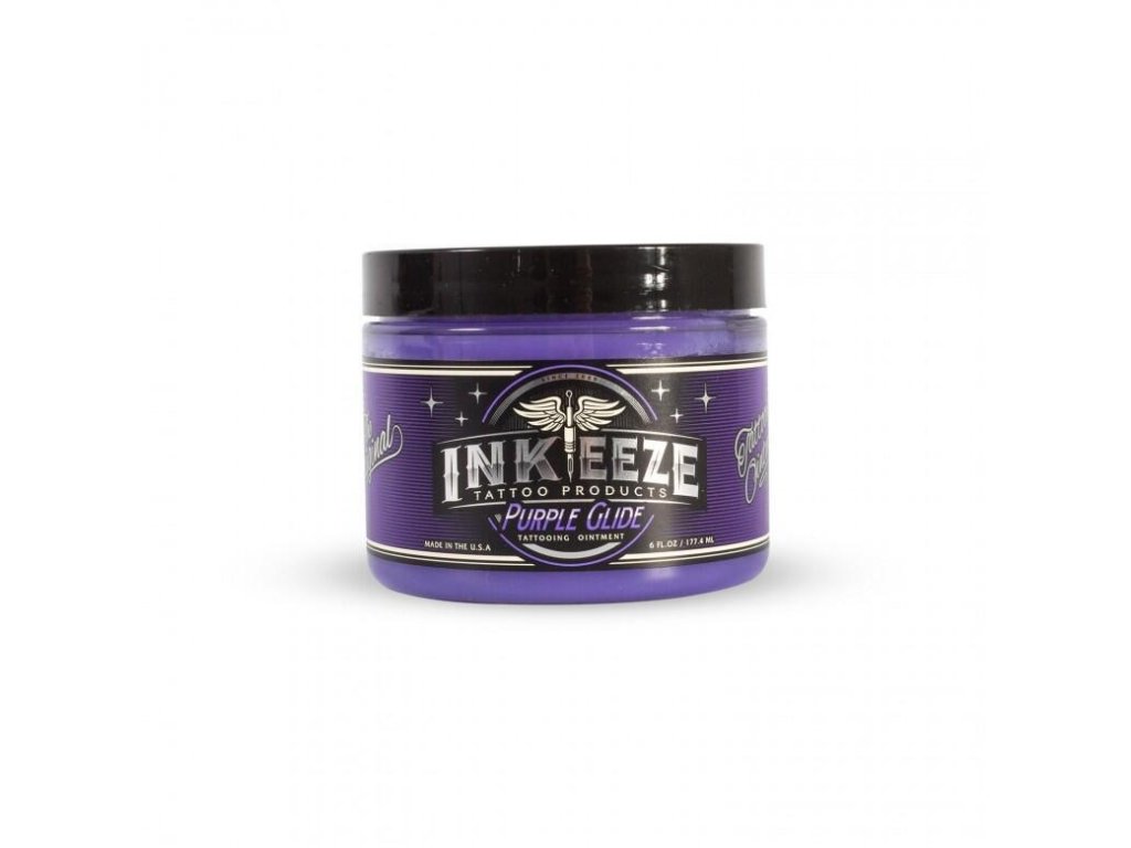 INK-EEZE Purple Glide to wazelina na bazie olejków eterycznych, a nie produktów ropopochodnych, takich jak standardowa wazelina. Jej formuła została opracowana przez światowych artystów tatuażu i ekspertów w dziedzinie pielęgnacji skóry. Pink Glide może być stosowany jako lubrykant podczas tatuowania, a także jako świeży produkt do pielęgnacji tatuażu, wspomagający gojenie. Ma charakterystyczny lawendowy zapach. Formuła Pink Glide zawiera olej z krokosza barwierskiego, olej z tykwy, wosk pszczeli i mleczko pszczele, które zmiękczają, nawilżają i chronią skórę. Idealny do stosowania podczas tatuowania i jako krem pielęgnacyjny. INK-EEZE Purple Glide zawiera. Scary, Rick Walters, Opie Ortiz, Clark North, Abey Alvarez, Dominic Vasquez, Nickhole Arcade, Ruthless, Rob Hill, Shaun Kama, James J. Peterson i Halo.