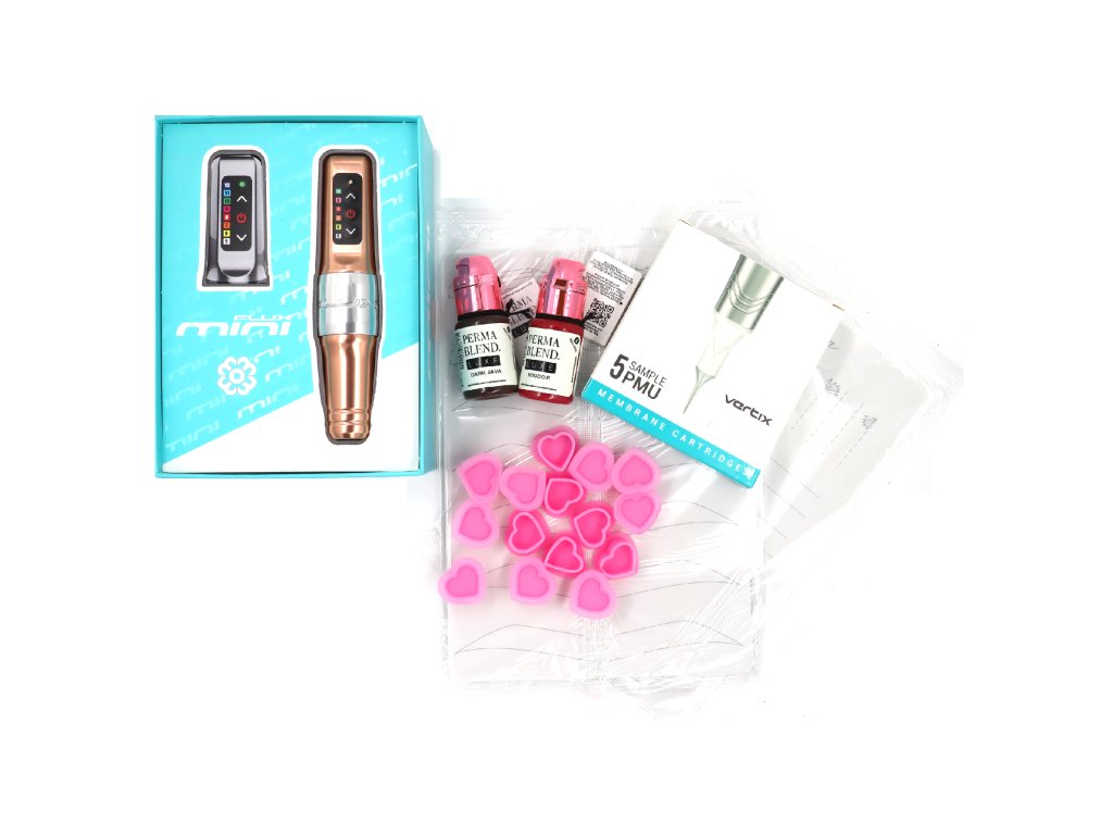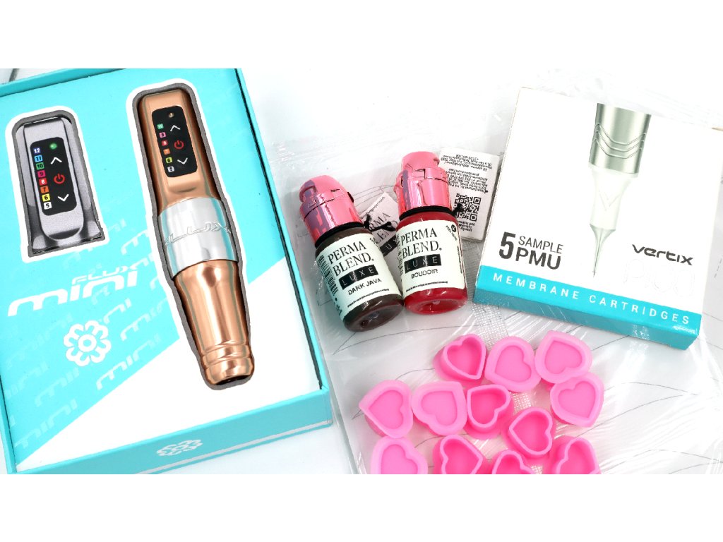 Zestaw przeznaczony jest dla specjalistów PMU, którzy wymagają precyzyjnej kontroli, stabilnej pracy i spójnych rezultatów. Łączy sprawdzone marki i obejmuje cały cykl pracy, od szkolenia technicznego po profesjonalną aplikację u klienta. Zawiera technologicznie zaawansowaną bezprzewodową maszynkę FLUX Mini o skoku 3,0 mm, pigmenty Perma Blend Luxe zatwierdzone przez EU REACH, wysokiej jakości wkłady PMU Vertix PICO, sztuczną skórę z wzorami Laskin oraz praktyczne silikonowe kubki.