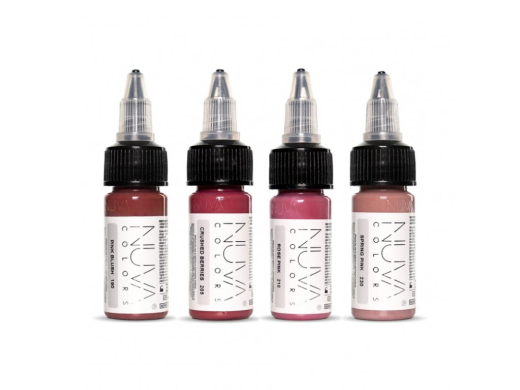 NUVA Colors Top Set to zestaw pigmentów przeznaczony do makijażu ust metodą PMU. Zawiera 4 starannie dobrane odcienie, które pokrywają chłodne i neutralne spektrum barw i pozwalają na precyzyjną pracę w zależności od fototypu klientki. Pigmenty można stosować osobno lub łączyć w celu uzyskania indywidualnego efektu.